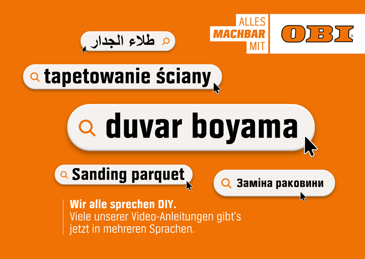Parkett abschleifen, Laminat verlegen, eine eigene Feuerstelle für den heimischen Garten bauen oder Raufasertapete anbringen: Video-Anleitungen zu Heimwerker-Projekten liegen voll im Trend, nicht nur bei der jungen Generation. Gut, wenn es solche Online-Tutorials nicht nur in einer Sprache gibt, sondern diese auch in der eigenen Muttersprache zur Verfügung stehen. How-To-Videos von OBI sollen künftig für jeden einfach nachvollziehbar sein, der Einstieg zu Do-It-Yourself (DIY) niedrigschwellig gestaltet werden – Sprache ist dazu ein zentraler Möglichmacher. Deshalb gibt es ab sofort viele der beliebten OBI Videos nicht nur auf Deutsch, sondern auch in den meistgesprochenen Fremdsprachen Deutschlands und Österreichs. OBI setzt mit der Initiative „Wir alle sprechen DIY“ ein nachhaltiges Zeichen für die gesamte Branche und leistet als Marktführer Pionierarbeit. Flankiert wird die Initiative durch eine reichweitenstarken Kreativ-Kampagne mit Out-Of-Home-Elementen, Digital Media und prominenten Stimmen wie Motsi Mabuse, Kida Khodr Ramadan, Ilkay Gündogan, Emilija Wellrock und DagiBee.